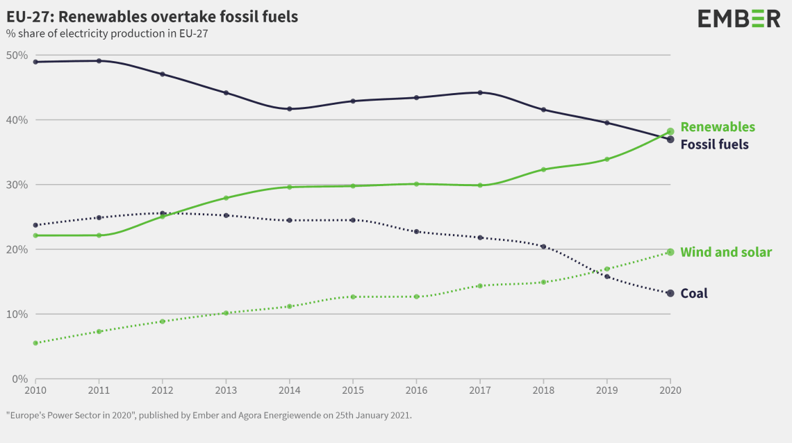 Obnovljivi izvori 2020.godine, prvi put generisali više struje od fosilnih goriva u EU. To pokazuju podaci izveštaja kompanije Ember and Agora Energiewende’s, koji prati evropsku tranziciju električne energije. U izveštaju je analizirana kompletnja proizvodnja električne energije tokom 2020. godine u svakoj zemlji EU. Petu godinu za redom Ember, uradio je analizu, u saradnji sa Agora Energievende.