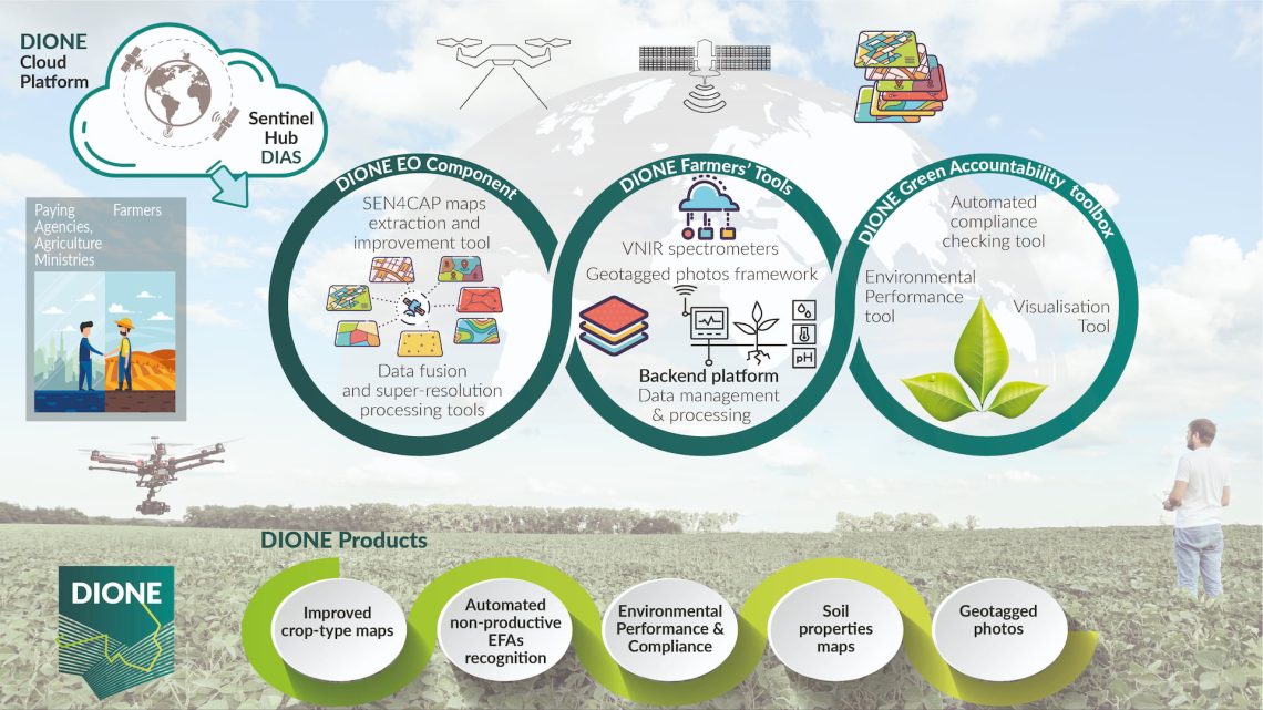 DIONE set alata je razvijen u okviru istoimenog projekta koji finansira Evropska Unija. Reč je o inovativnom rešenju koje omogućava evropskim agencijama za agrarna plaćanja da poštuju modernizovane propise Zajedničke poljoprivredne politike-ZPP(CAP). U isto vreme sprovode procenu ekološkog učinka ozelenjavanja. Na nacionalnom ili regionalnom nivou u zavisnosti od nadležnosti agencije.Pored agencija za agrarna plaćanja kao glavnih korisnika, ovi alati su dizajnirani tako da ispune zahteve pametnog monitoringa poljoprivrede. A te usluge pružaju tela za sertifikaciju i kontrolu, odnosno Sertifikacione kuće.