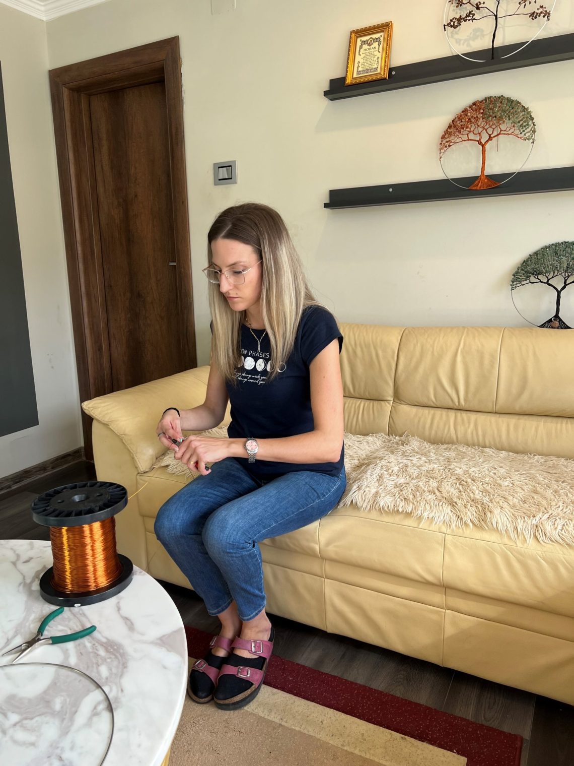 „Ideju sam dobila pre dva meseca kada sam sebi htela da napravim zidnu dekoraciju. Dopalo mi se i počela sa drugima da pravi drvo sreće ili života od bakarne žice. Ovu ideju sam videla na tik toku. Odmah odmah sam znala da želim time da se bavim. Nije teško samo je potrebno puno strpljenja“, rekla je Ibolja Marinković koja od neobičnih poredmeta pravi mala umetnička dela.