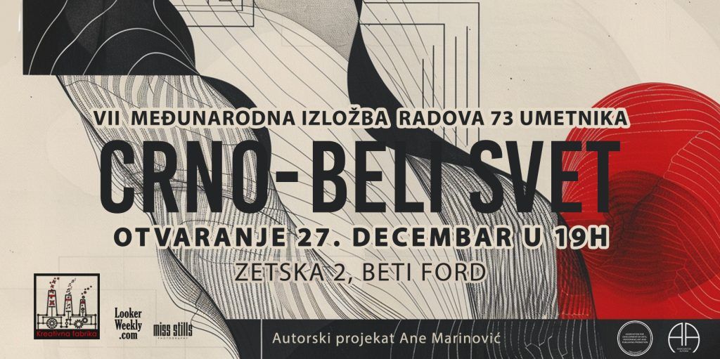Izložba „Crno-beli svet“ biće otvorena za javnost od 27. decembra 2025. do 27. januara 2026. godine u Galeriji „Beti Ford“. Ovo je jedinstvena prilika da vidite preko 70 radova iz različitih zemalja, različitih tehnika i pristupa, sjedinjenih zajedničkom temom kontrasta i forme.